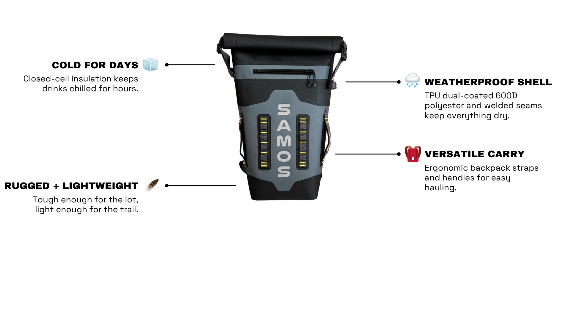 The Samos HEX is a waterproof, insulated roll-top bag built for people who don’t sit still. It’s designed to move seamlessly from tailgates to trails, festivals to commutes, keeping your gear dry, your drinks cold, and your weekend wide open.